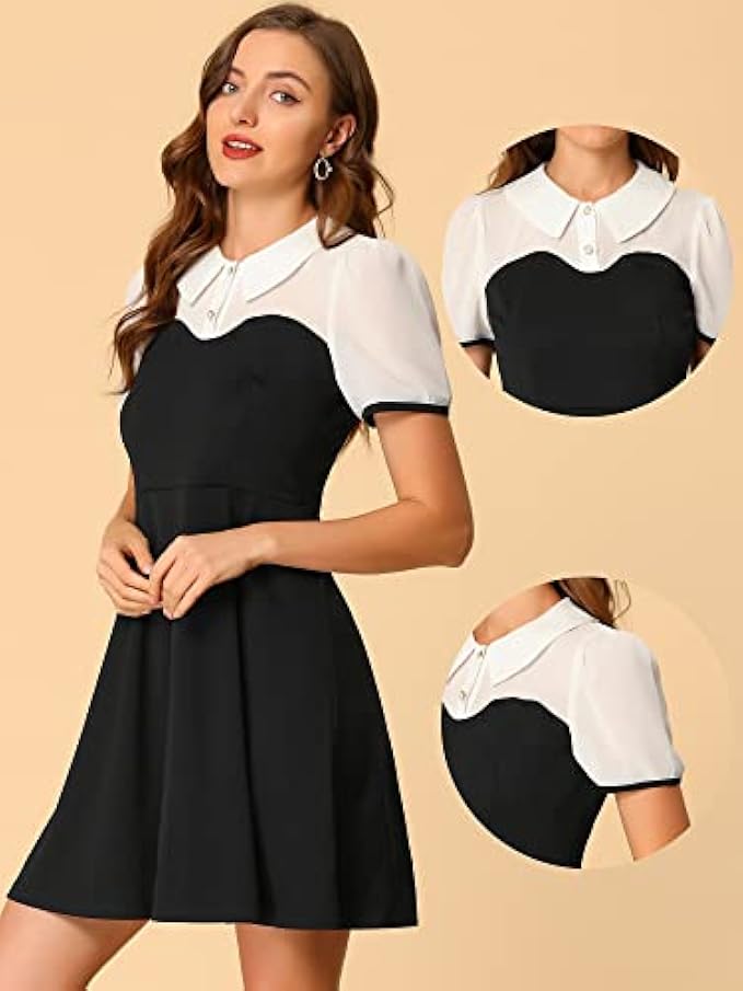 Allegra K 優雅洋裝 女款 娃娃領 短袖 高腰 對比拼接工作洋裝, Medium